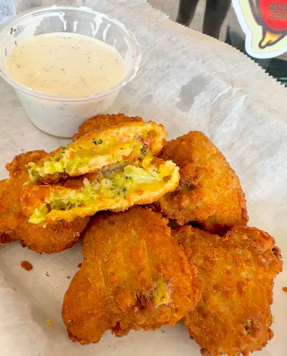 Bite-sized broccoli and cheese fritters with crispy bacon fried to a crispy golden finish.