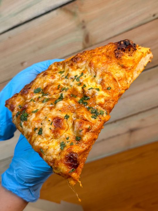 A buttery garlic base topped with a blend of cheeses, double pepperoni, grilled chicken, bacon, and caramelized onions, finished with a drizzle of buttermilk ranch and Mike’s Hot Honey. Available in classic or stuffed crust. Created by a good friend, this pizza was named in his honor—a truly one-of-a-kind flavor experience.