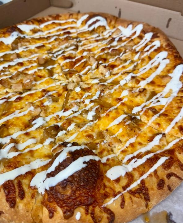 A creamy ranch and garlic base topped with a blend of cheeses, tender grilled chicken, crispy bacon, and caramelized onions, finished with a drizzle of house-made buttermilk ranch dressing for extra flavor.