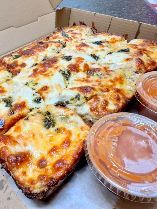 A garlic cream sauce base topped with a blend of four cheeses, finished with a basil reduction. Served with a side of creamy tomato sauce for dipping—an elevated take on the classic comfort food combination. Pictured is our Detroit style or you can get it in our stuffed crust style